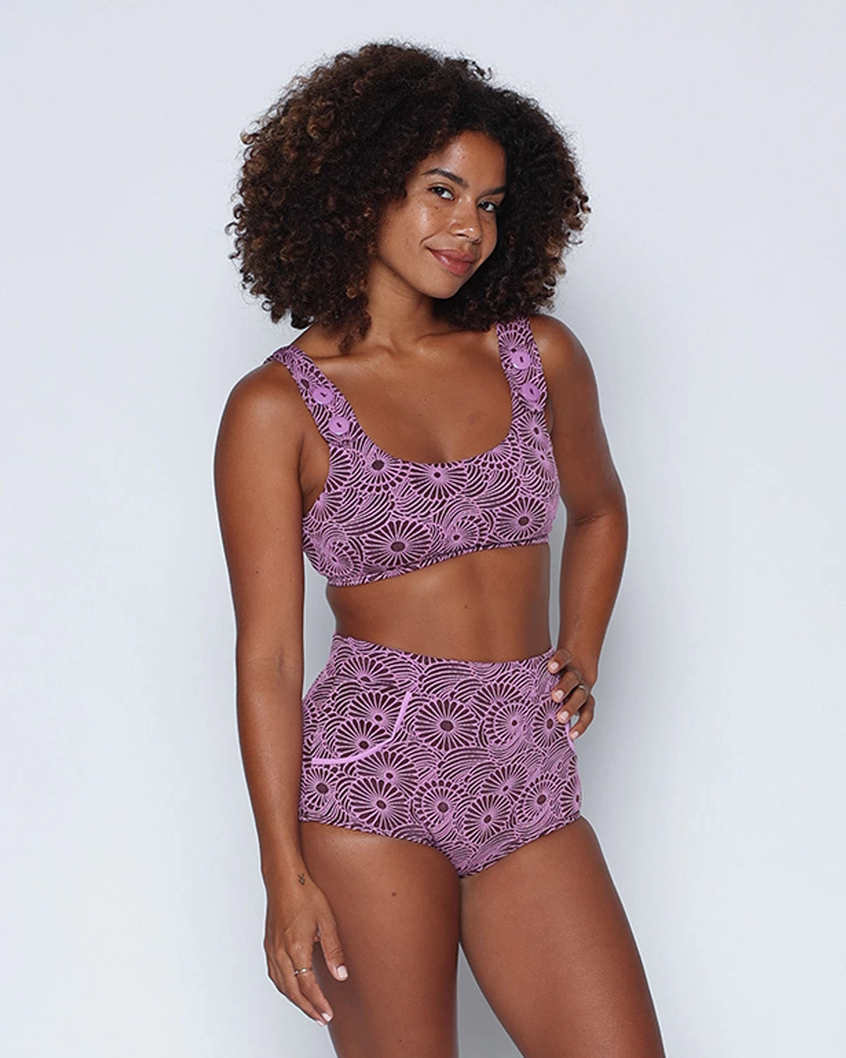 Under a striped beach umbrella or perched in trim, the Georgia High Waist Bikini Bottom radiates vintage femininity. The high waist design, contrasting curved trim, and retro leg cut shape a classy and comfortable silhouette.