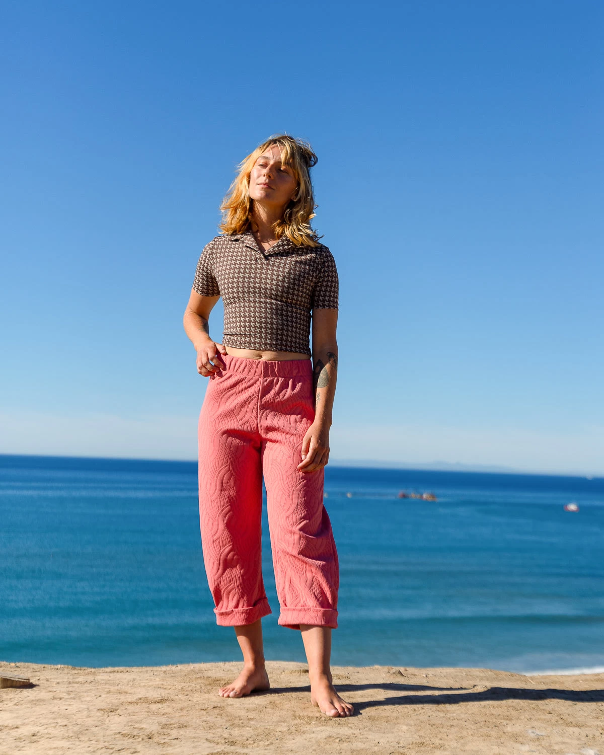 The relaxed Keiko Pant will be your go-to for lazy summer mornings and aprรจs surf chilly sunsets. Featuring textured fabric, comfy elastic waistband and cropped cuffed hem for sandy feet.