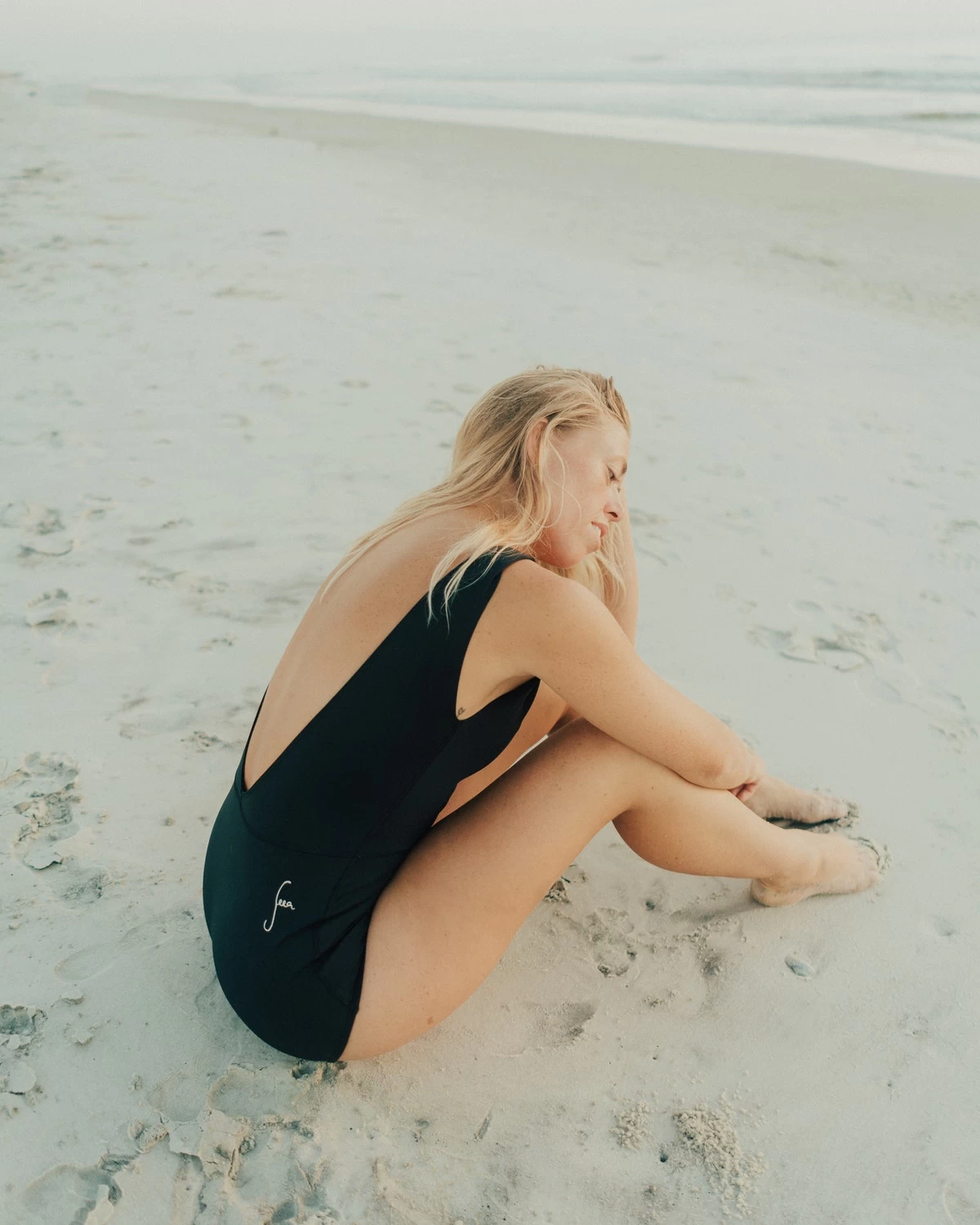 Modern minimalists will appreciate the Lido One-Piece’s clean silhouette and balanced color-blocking. With a high neckline, retro cut bottom, and a sultry deep-V back, the Lido in recycled C-Skin fluidly glides over your body’s curves. This classic black one piece is a tried and true favorite that will truly never go out of style.Â