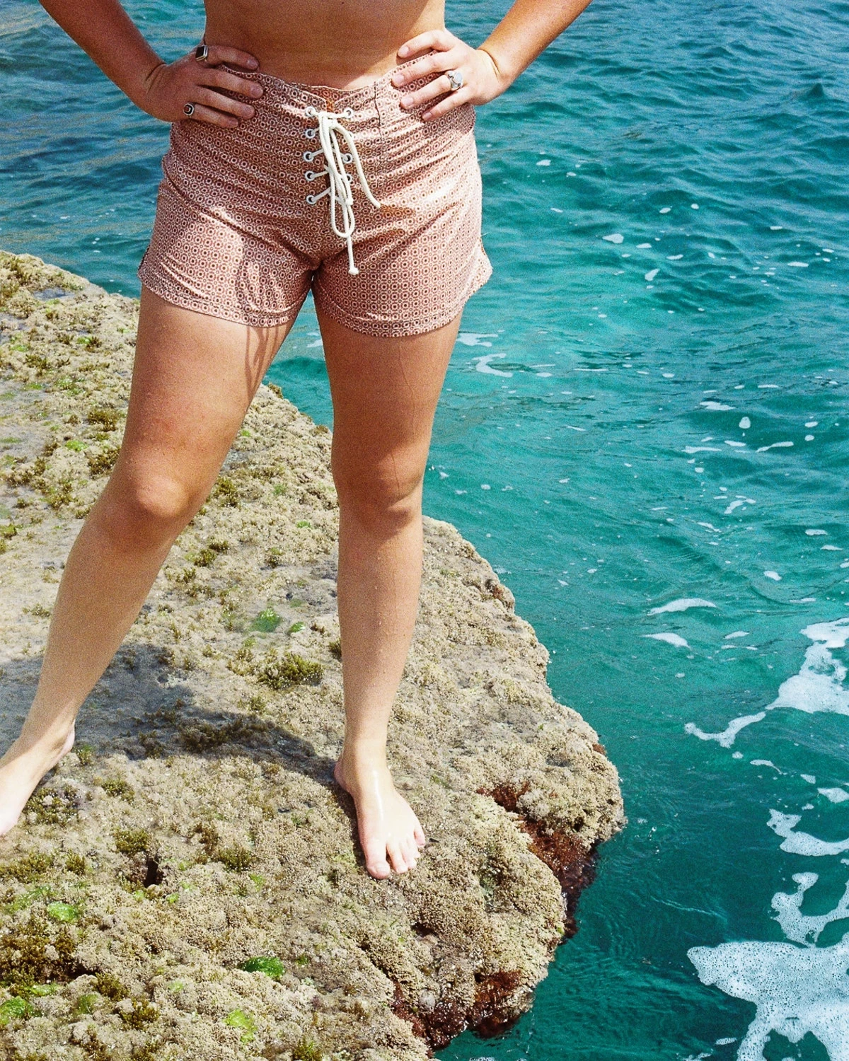 We’re calling it: board shorts are back! The Lulu Shorts borrow everything we love about vintage versions—a high rise cut that hugs your hips, yet roomy around the leg opening—and remakes them spectacularly flattering and comfortable. Tighten up the lace-up front when you need them to stay on through whitewater or loosen them up while sitting shotgun on a long road trip. Co-designed with photographer Lucrecia O’Keefe!