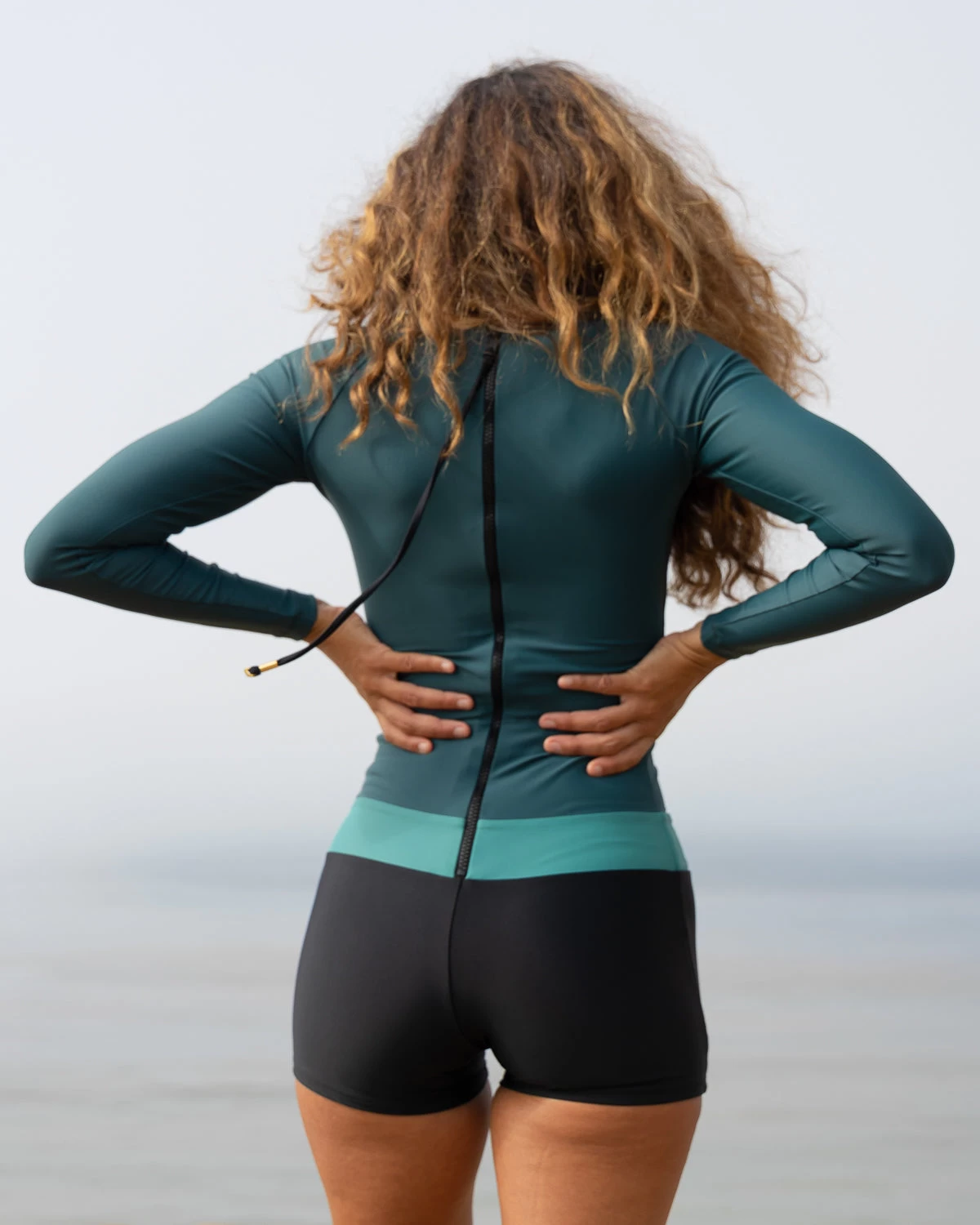 closes the gaps between rashguard, boardshorts, swimsuit, and cuteness. This long-sleeved one-piece wonder with flattering dropped waistband and attached minishorts is the ultimate playsuit for both saltwater and freshwater fun.