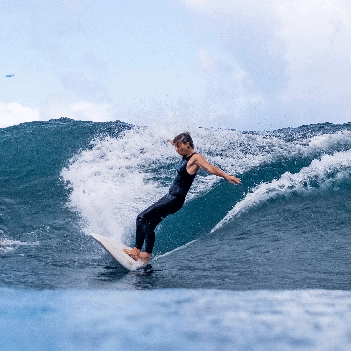 This suit is made out of Yulex, a plant-based replacement for neoprene. It is very stretchy so if you’re in between sizes, we recommend sizing down.