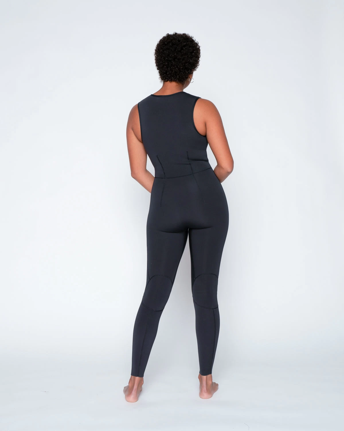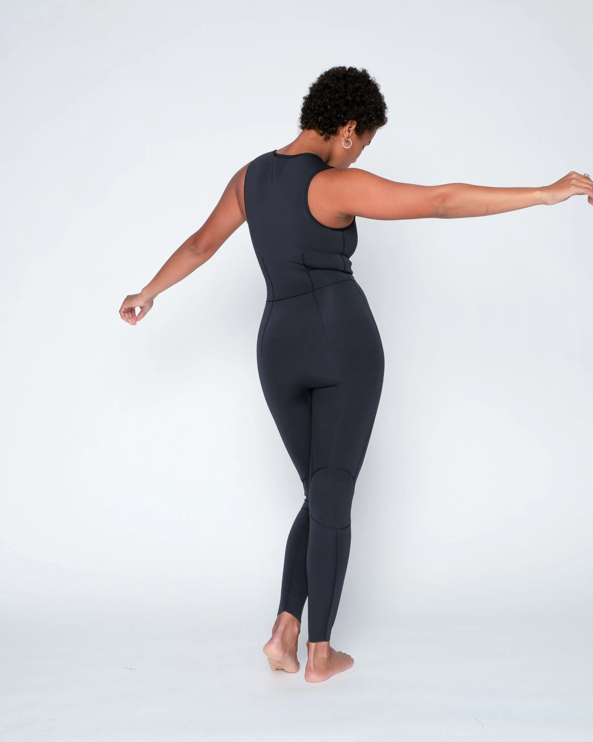 For cooler waters on beautiful sunny days, the Sydney 2mm natural rubber sleeveless Long Jane will be your new favorite companion. The sleeveless style with long legs provides just the right amount of core warmth and protection for sensitive ribs and knees while feeling lighter and freer than a full suit. A velcro and button shoulder opening makes it easy to slip in and out of, plus darts on the waist mold for a snug and flattering fit. The knees are reinforced with extra padding for durability and comfort while knee paddling.