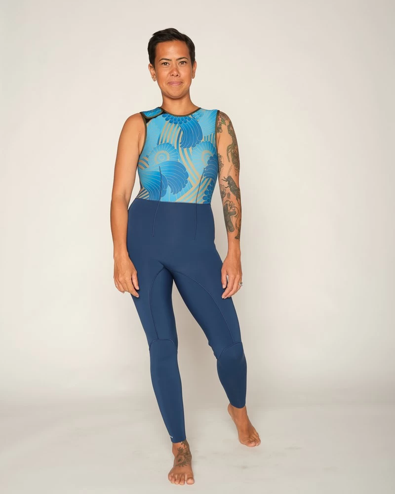 For cooler waters on beautiful sunny days, the Sydney 2mm natural rubber sleeveless Long Jane will be your new favorite companion. The sleeveless style with long legs provides just the right amount of core warmth and protection for sensitive ribs and knees while feeling lighter and freer than a full suit. A velcro and button shoulder opening makes it easy to slip in and out of, plus darts on the waist mold for a snug and flattering fit. The knees are reinforced with extra padding for durability and comfort while knee paddling.