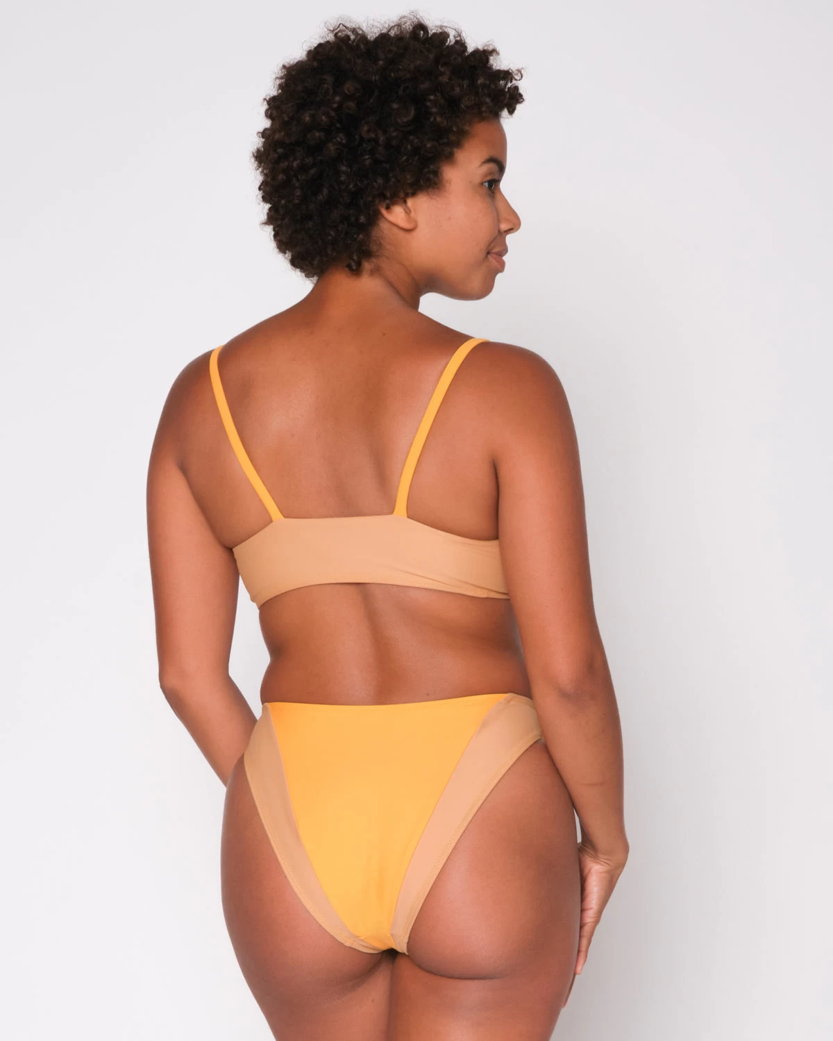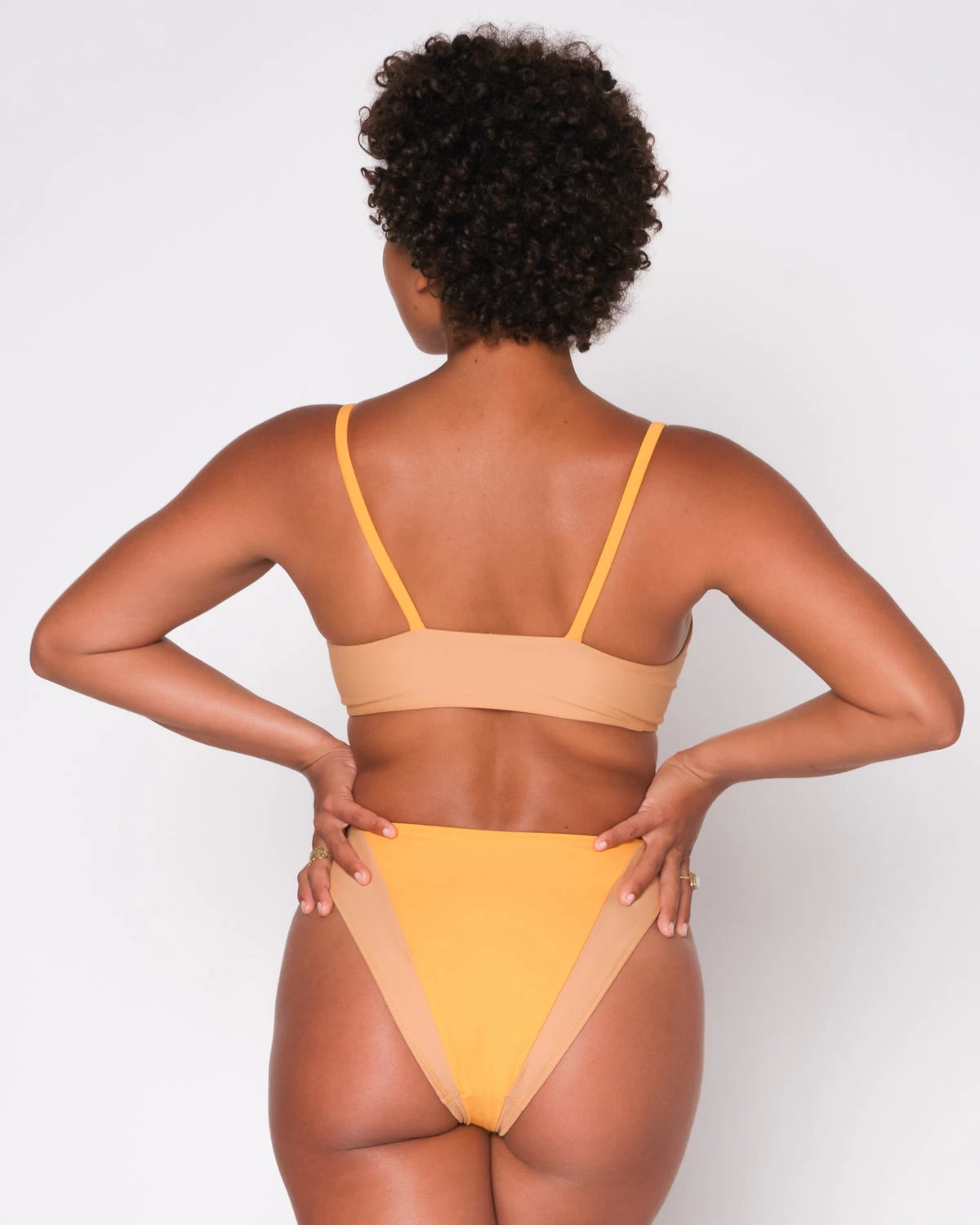 Striking color-blocking and elegant curved lines, the Vega Bikini Bottom features a vintage-inspired high leg cut and mid-rise bottom.